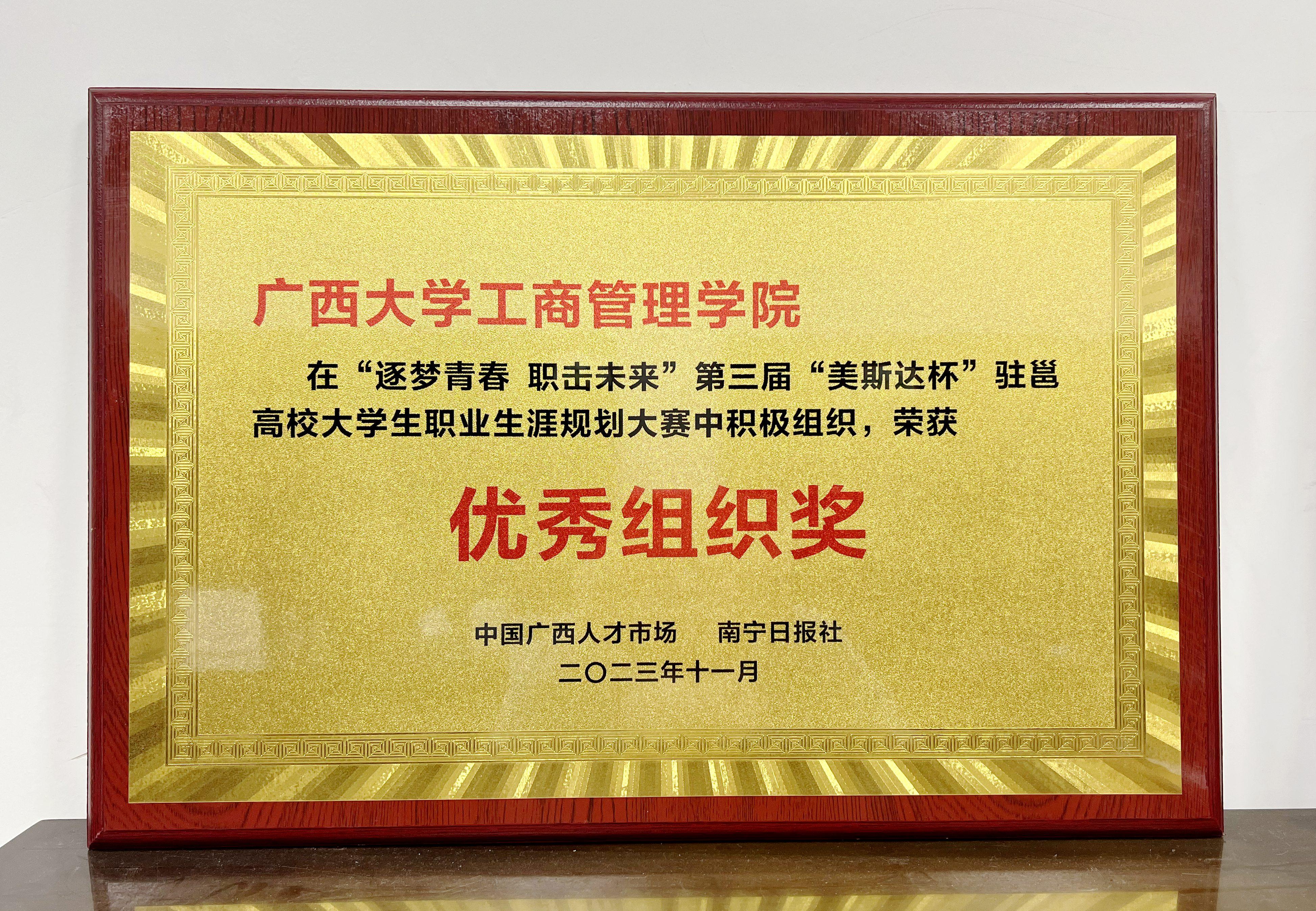 近日,由中国广西人才市场、南宁日报社主办的“逐梦青春·职击未来”第三届“美斯达杯”驻邕高校大学生职业生涯规划大赛圆满帷幕。万象城官网荣获大赛“优秀组织奖”。