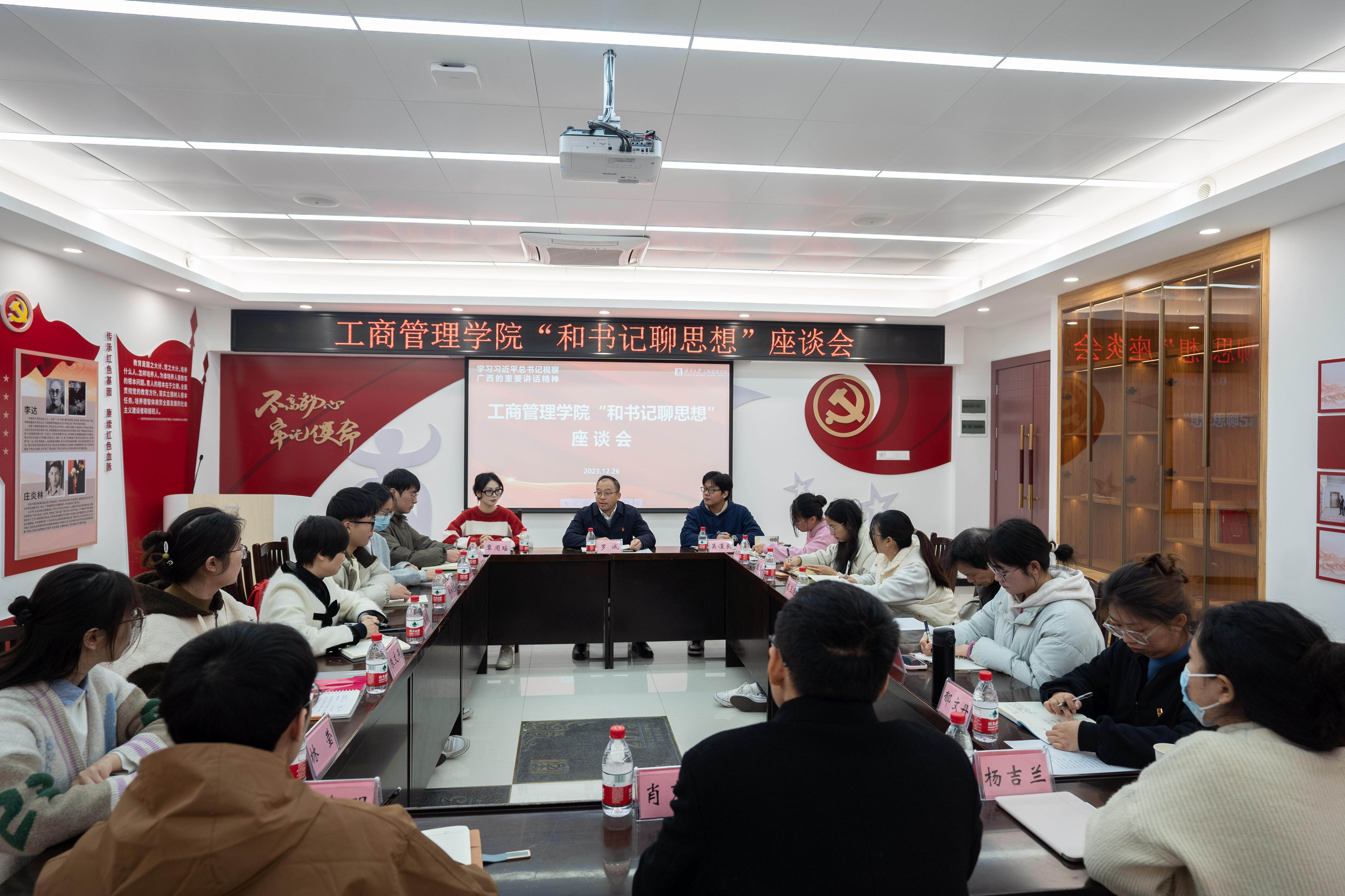 12月26日上午,万象城官网在党员活动室开展“和书记聊思想”活动,深入学习领会习近平总书记视察广西的重要讲话精神。学院党委书记罗诚与13名学生干部代表面对面交流,了解同学们的理论学习感悟、思想动态、日常学习生活等方面情况。学院党委副书记肖克宁、团委书记马丽娟、组织员黄照温、辅导员郁文丹参与活动。