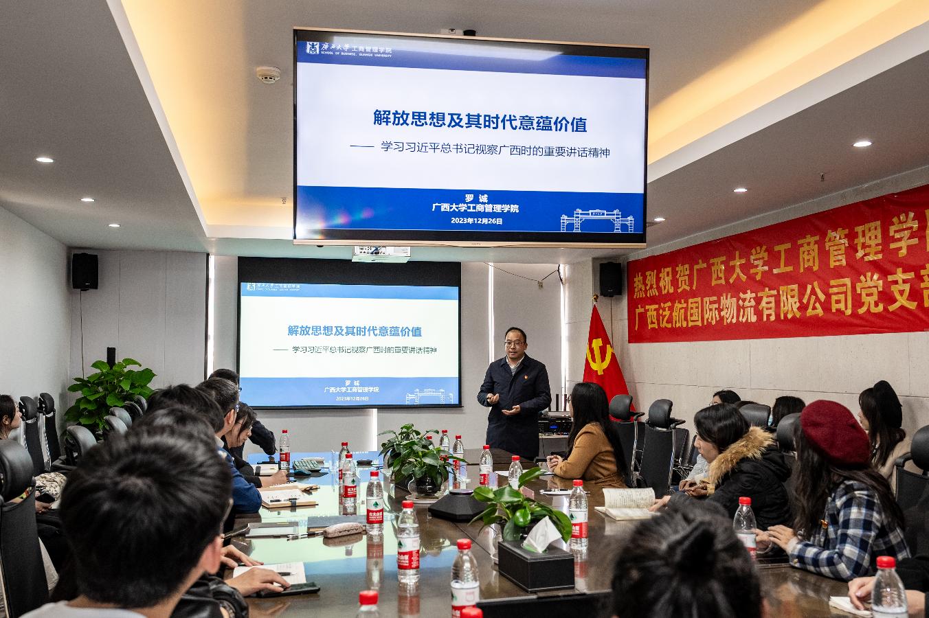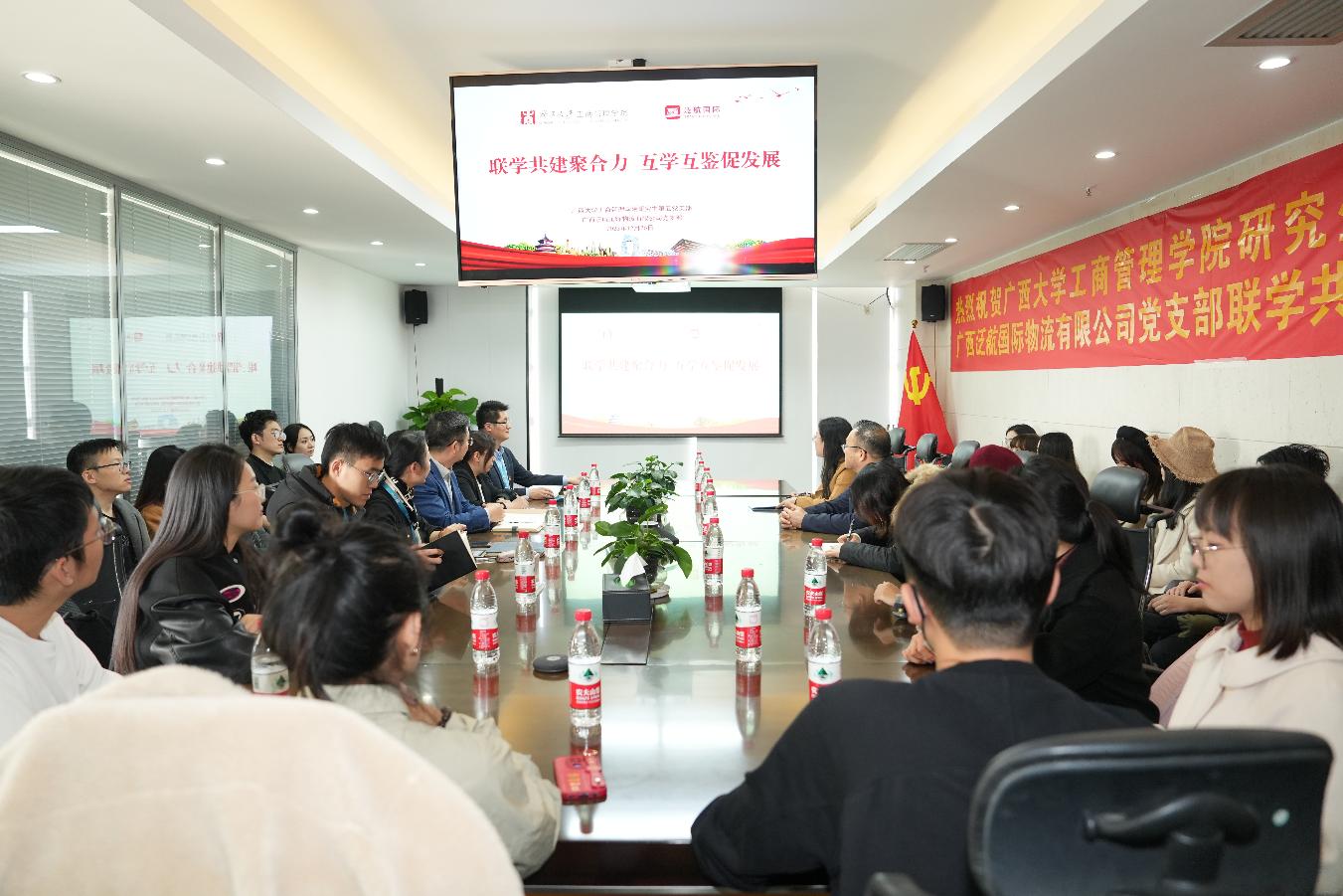 为深入学习习近平总书记视察广西时的重要讲话精神,深化产教融合,推动校企党建联动共建发展,12月26日下午,万象城官网研究生第五党支部赴广西泛航国际物流有限公司(以下简称“泛航公司”),探访民营企业发展环境,了解现代民企发展现状及趋势,并与该公司党支部开展联学共建活动。学院党委书记罗诚,泛航公司党支部书记、董事长、allwincity万象城MBA校友会副会长贺忠及公司管理层人员,万象城官网研究生第五党支部书记毛德君及近30名支部成员参加了活动。