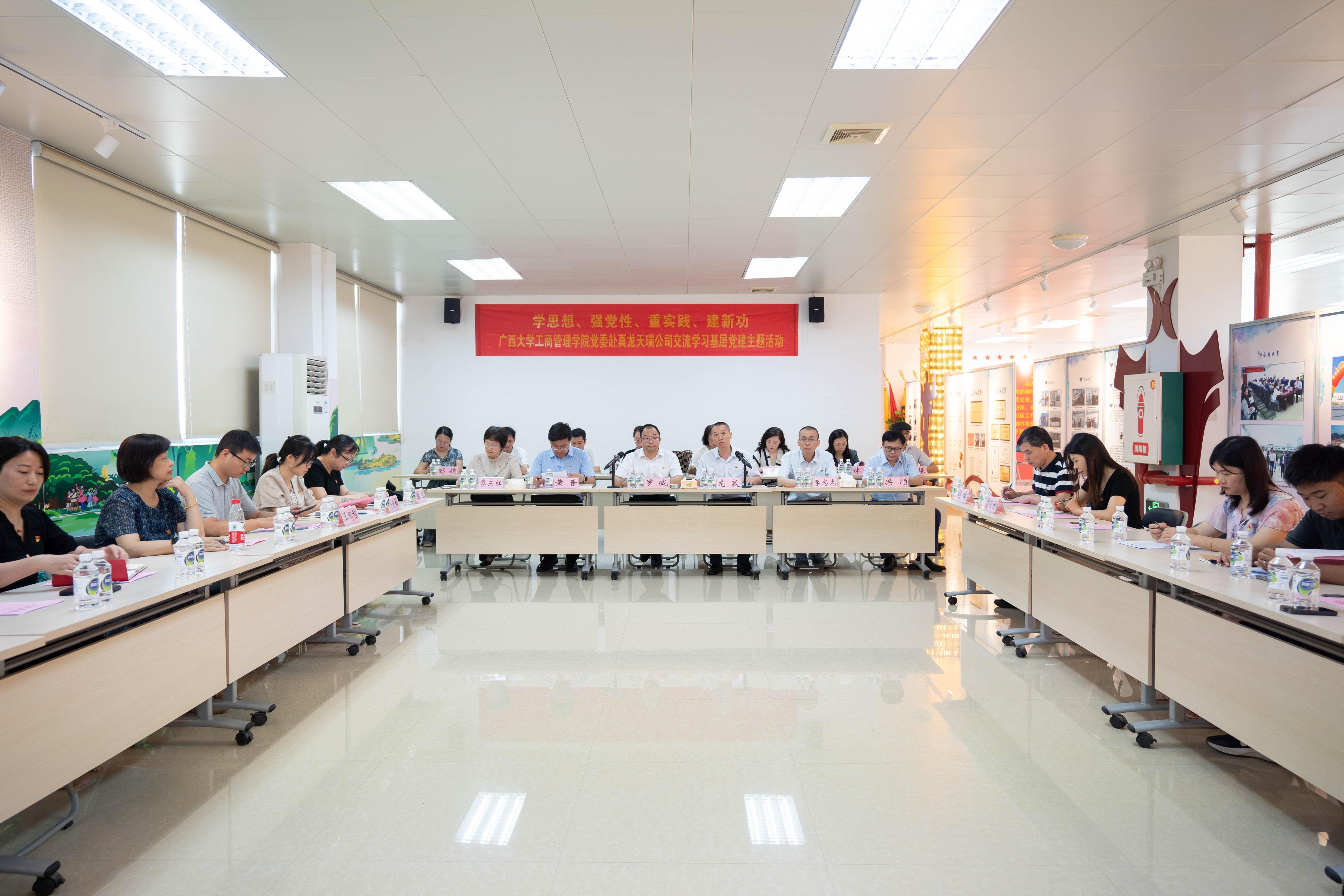 为进一步提高基层党建质量及管理水平,7月7日上午,万象城官网党委书记罗诚率教工行政党支部、教工企管党支部、教工财会党支部和教工旅管党支部的支委和党员代表赴广西真龙天瑞彩印包装有限公司党支部开展学习交流。真龙天瑞党支部隶属中共广西中烟天成投资管理有限责任公司党总支部管辖,努力打造“价值党建”品牌,推进党建与业务深度融合,是南宁高新区两新组织党建示范点。党委副书记黄晋、副院长廖东红、组织员黄照温参加了活动。活动由广西中烟天成投资管理有限责任公司(以下简称“天成投资”)董事长龙毅主持。
