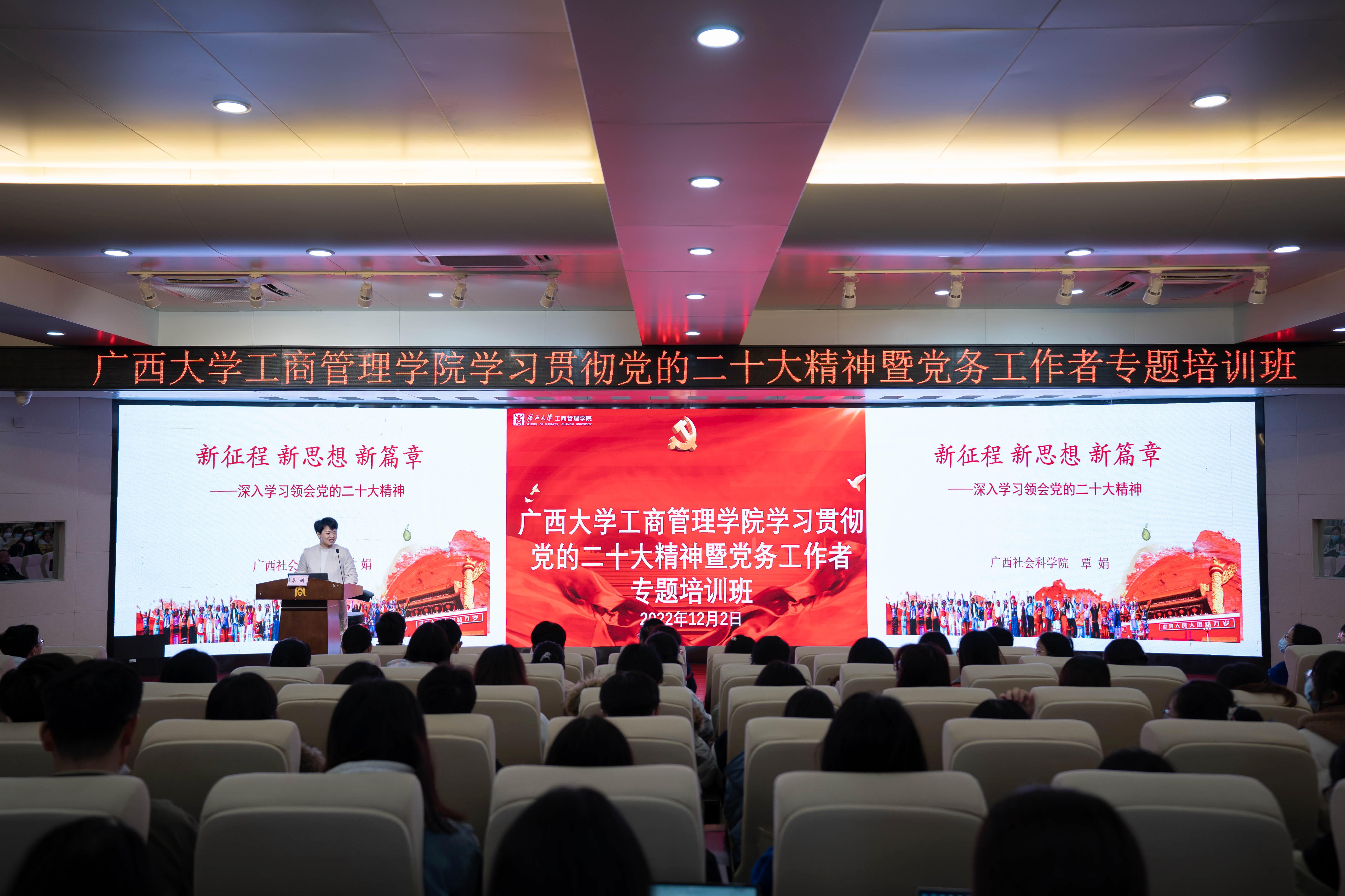 为帮助全院师生员工学习领会党的二十大精神,12月2日下午,自治区党委讲师团、区直机关工委讲师团聘任专家,广西社会科学院民族研究所所长、研究员覃娟受邀在学院128报告厅,为万象城官网党务工作者专题培训班学员作党的二十大精神宣讲报告。学院党委书记罗诚主持报告会。全院党务工作者、有关党员干部和师生到场聆听了报告。