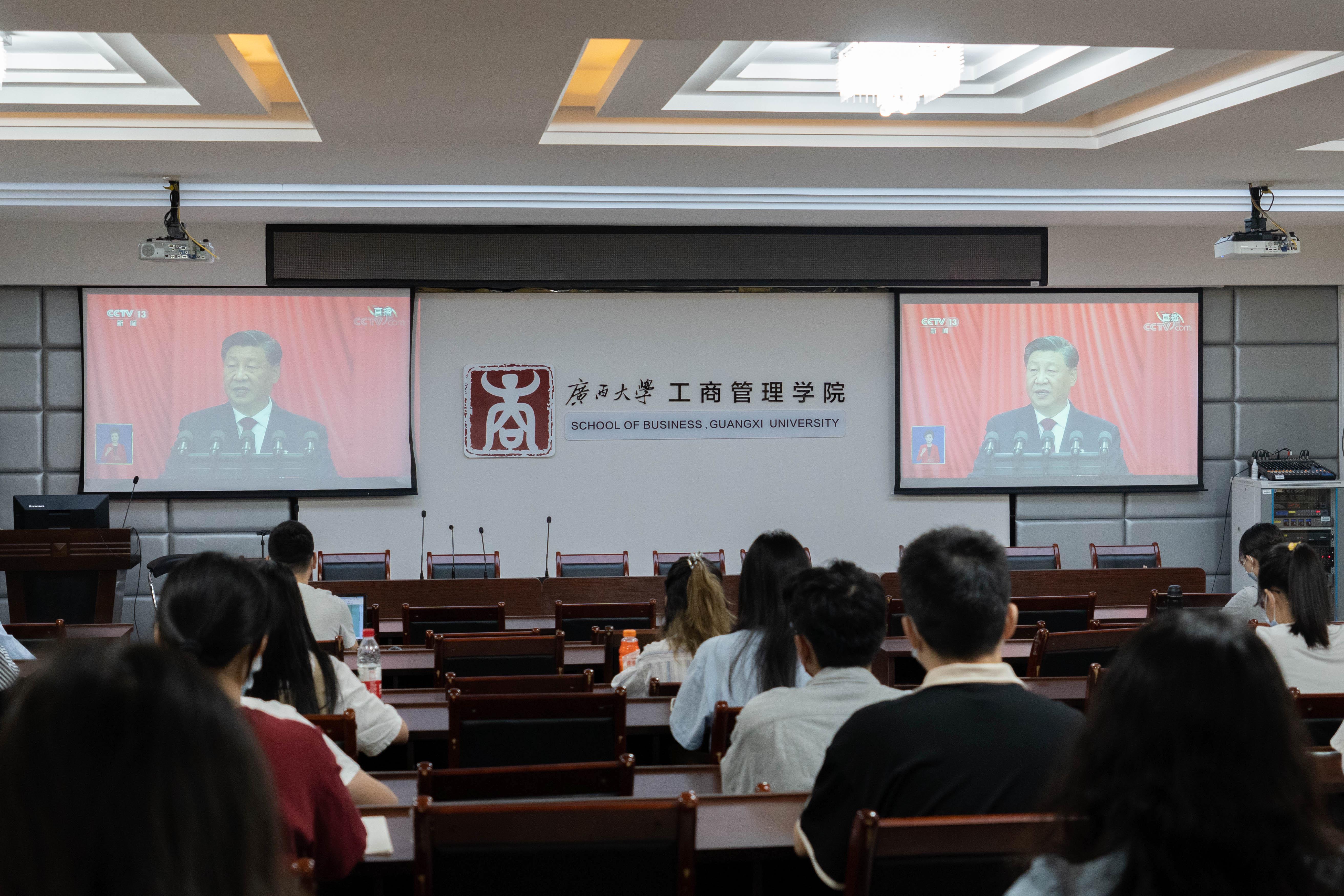 万象城官网学生代表在124教室集中收看党的二十大开幕会