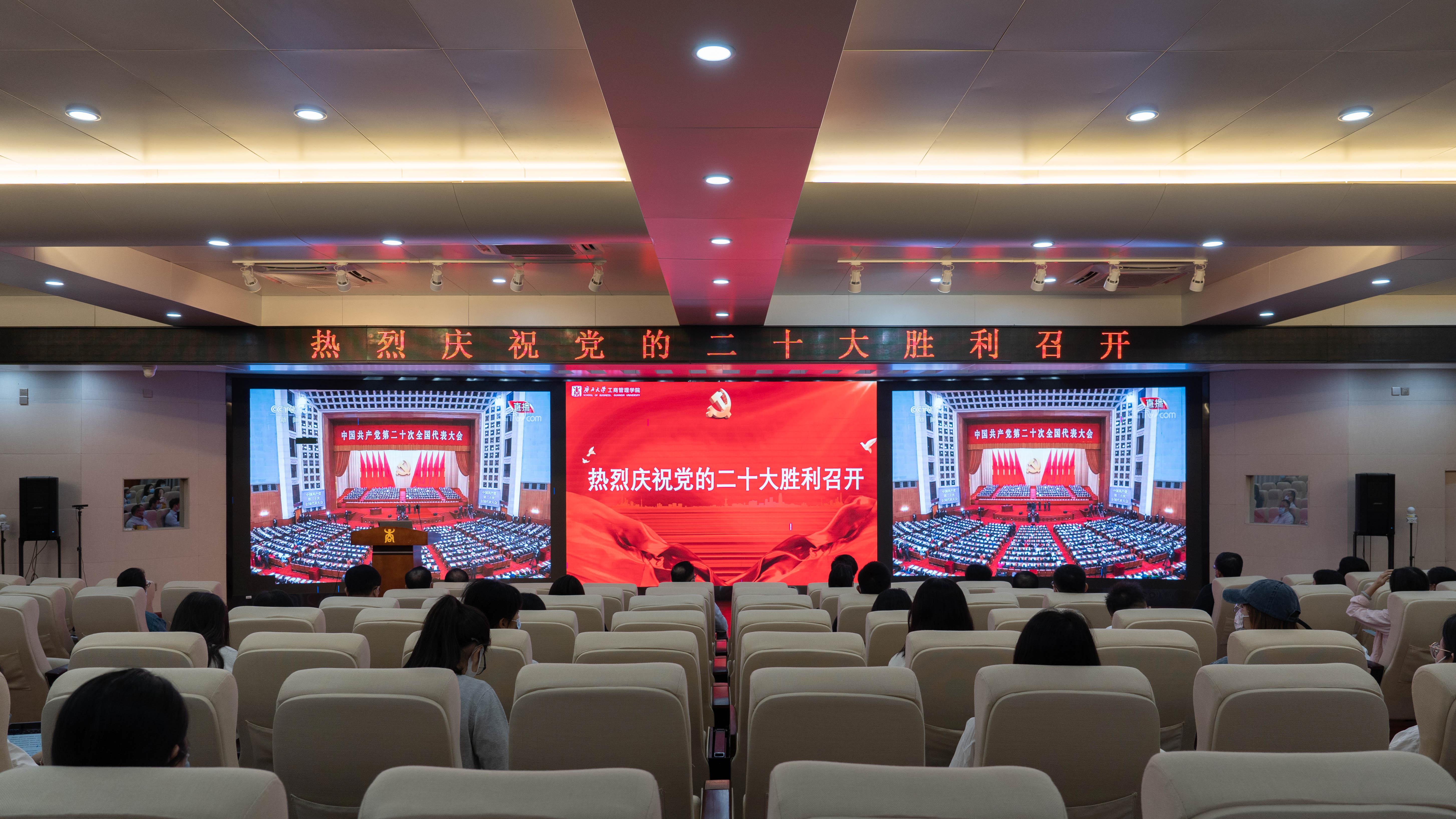 万象城官网党员干部、教师代表在128报告厅集中收看党的二十大开幕盛况