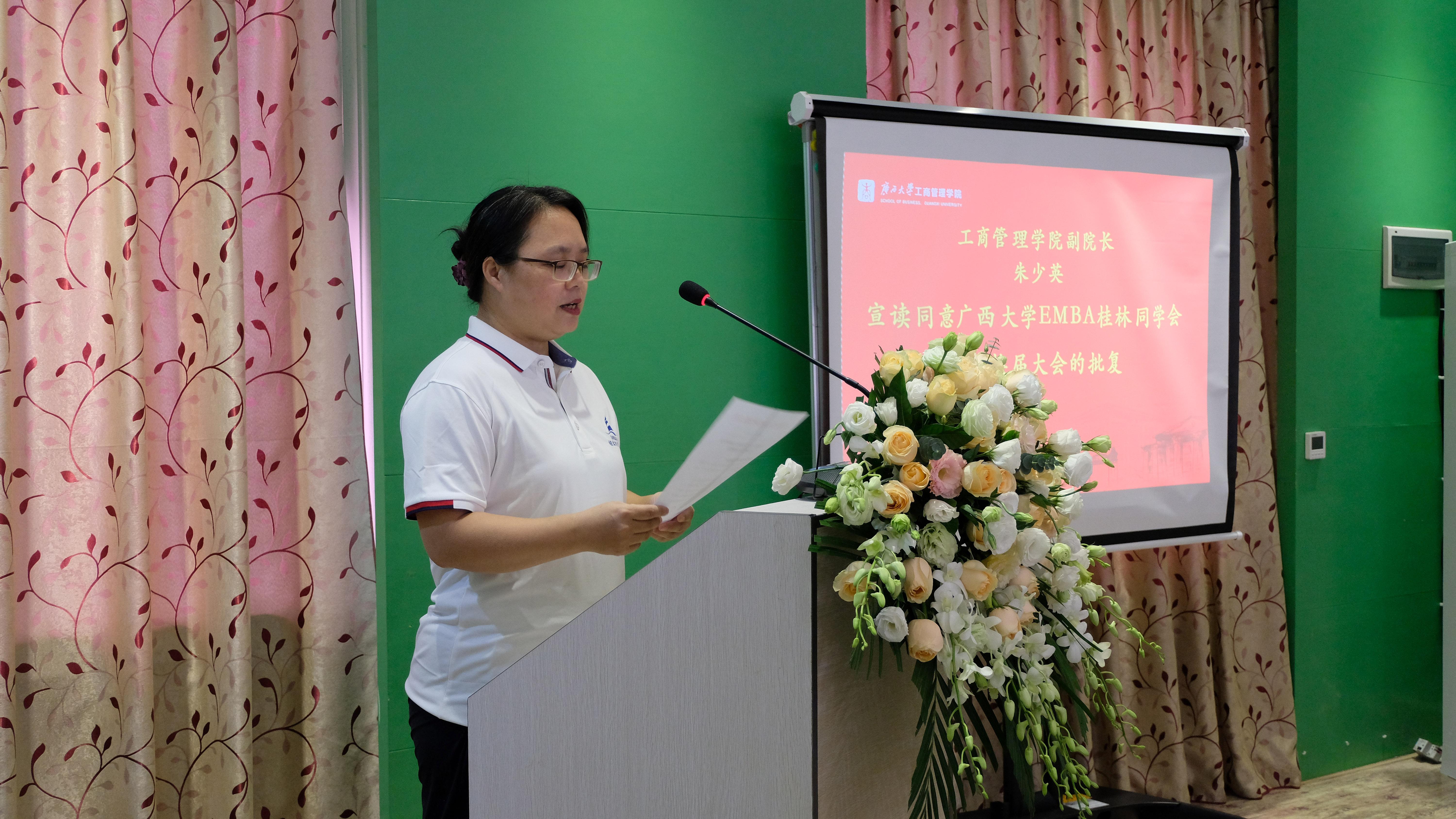 朱少英副院长宣读《同意allwincity万象城EMBA桂林同学会召开换届大会的批复》