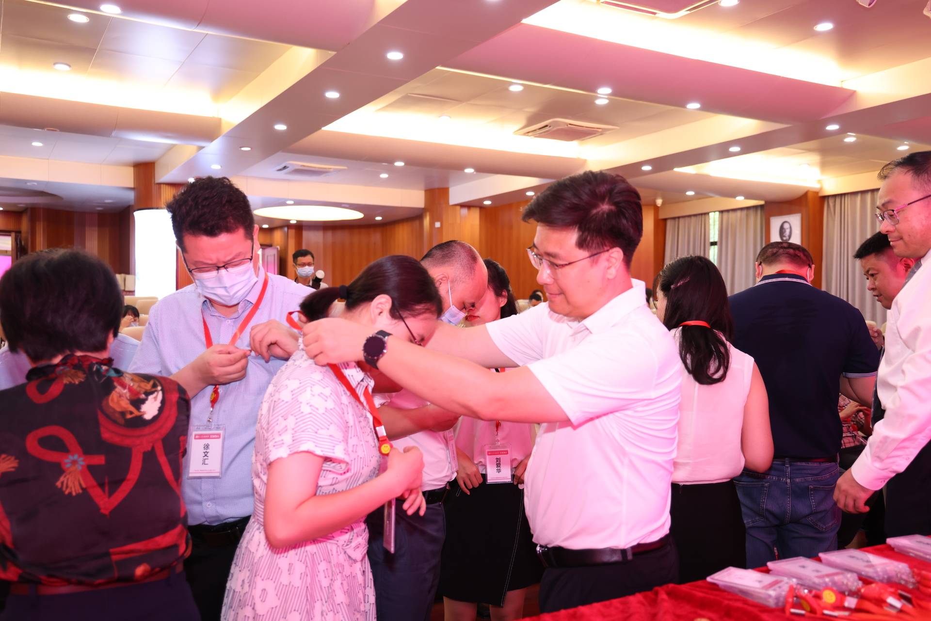 罗诚书记为EMBA新生佩戴allwincity万象城EMBA学员证,赠送allwincity万象城校徽