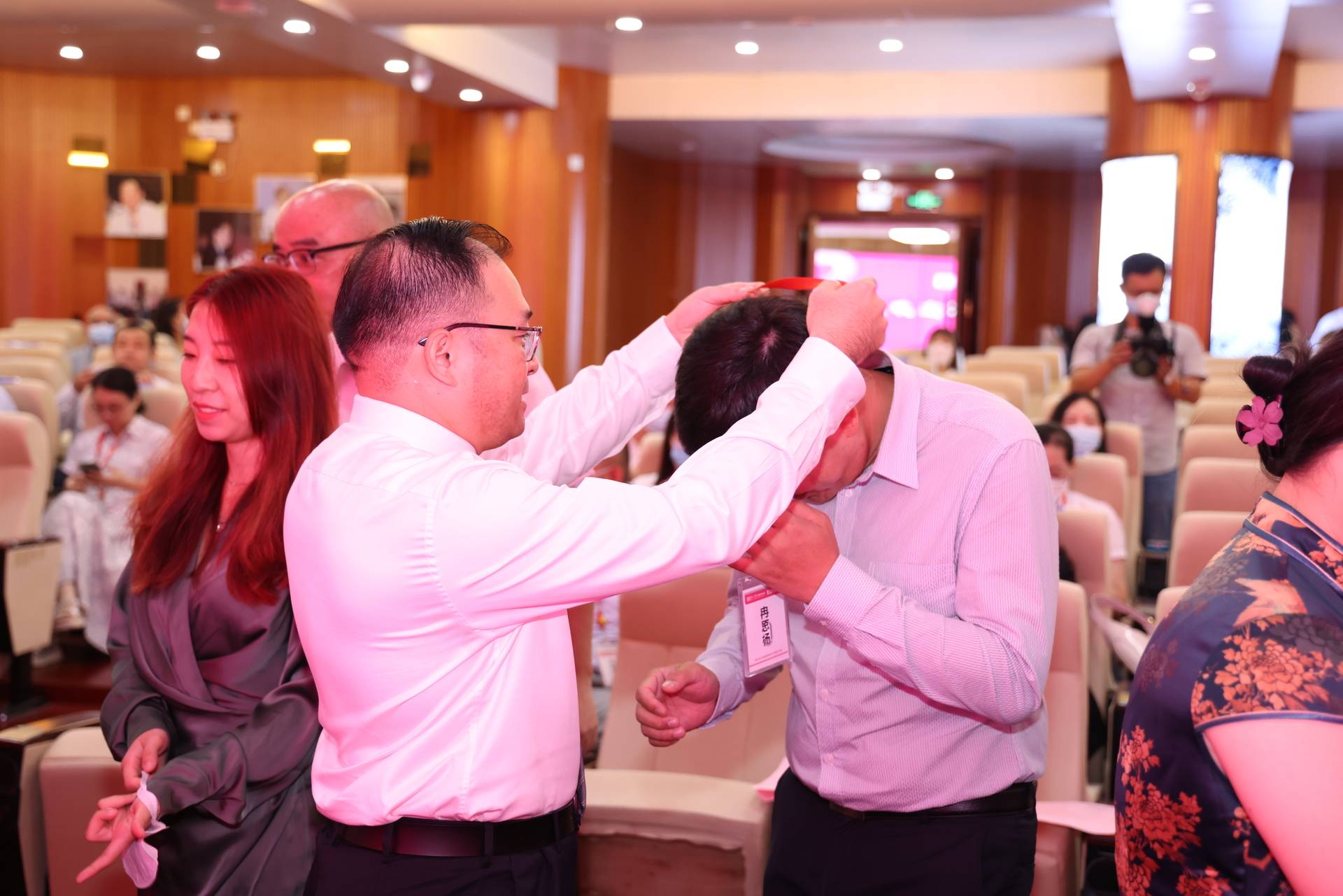 廖东红副院长为EMBA新生佩戴allwincity万象城EMBA学员证,赠送allwincity万象城校徽