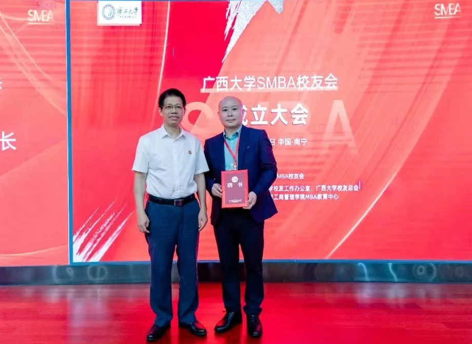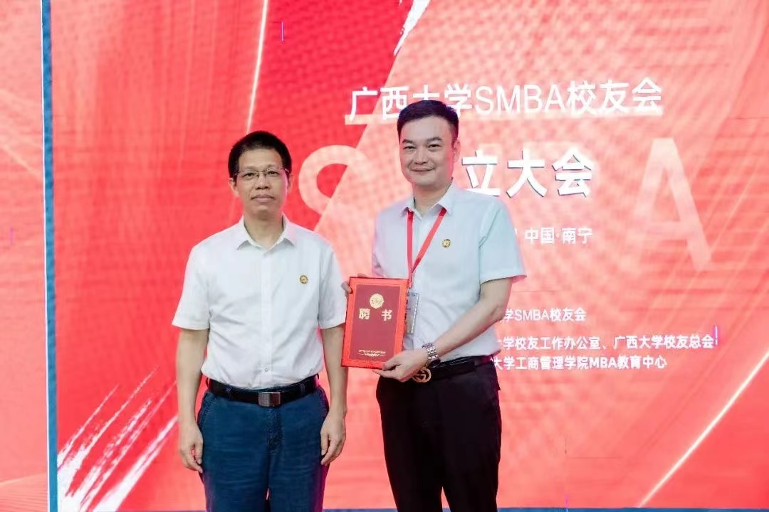 allwincity万象城党委常委、总会计师、校友总会常务副会长宁旭初(左)为SMBA校友会会长莫兴锋颁发聘书