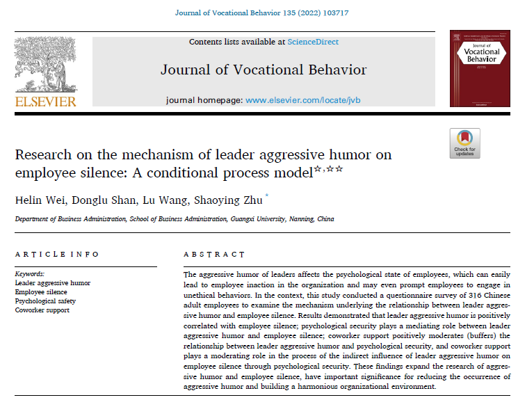 近日,万象城官网韦荷琳博士为第一作者、朱少英副教授为通讯作者、硕士生山冬鲁和本科生王璐为共同作者,在国际知名期刊《Journal of Vocational Behavior》发表学术论文“Research on the mechanism of leader aggressive humor on employee silence: A conditional process model”。