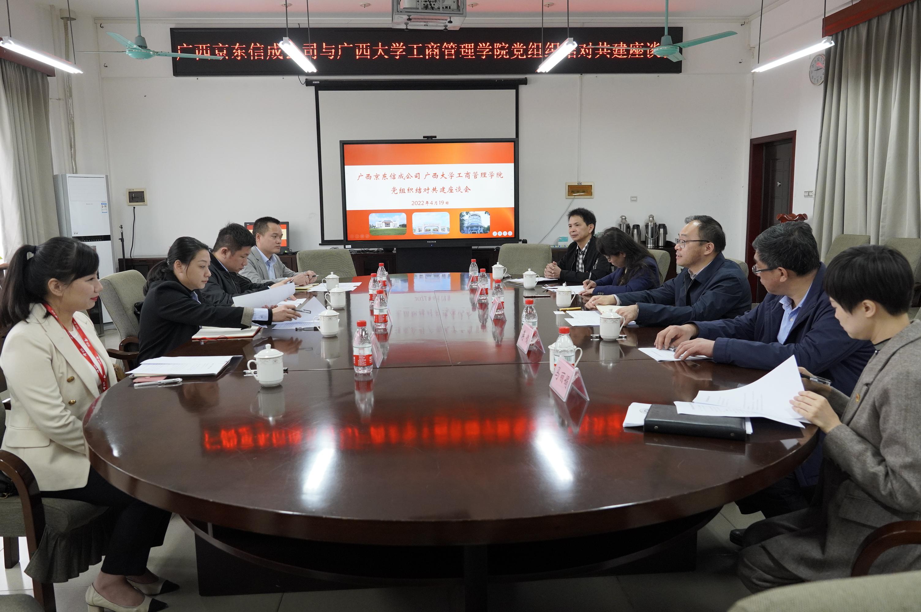 4月19日上午,京东集团区域公共事务总监、广西京东信成公司党总支书记张霓一行4人到万象城官网洽谈院企党组织联学共建、产学研合作业务并举行座谈会,万象城官网党委书记罗诚主持会议。