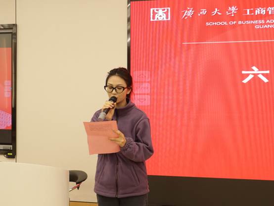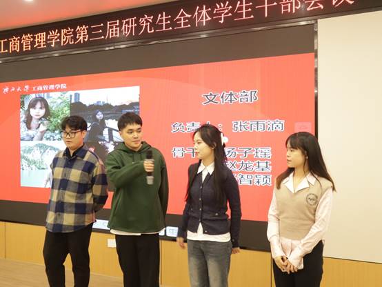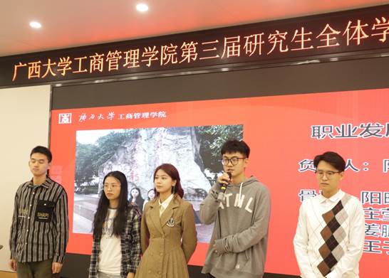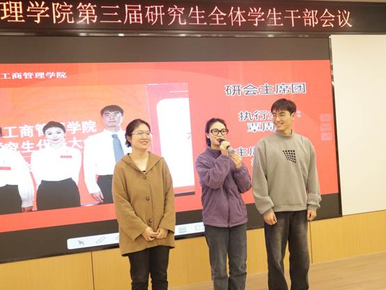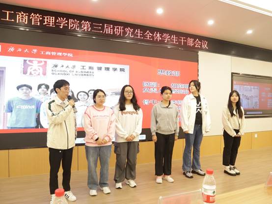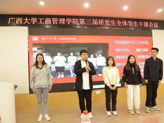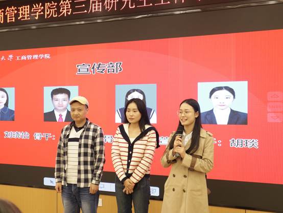 最后,研究生会新任执行主席覃周瑶同学代表研会全体成员就未来工作设想发言。她强调首先研究生会要突出政治属性,研会干部要在组织内、同学中起到引领、规范的榜样作用,在各类活动中体现思想政治素养,将思想教育融入每一次的活动当中。其次要完善工作机制,不断调整、优化工作流程,提质增效。最后,研会干部要起到模范作用,强化服务意识,牢记“全心全意为同学服务”的宗旨,同时,她呼吁大家要开拓进取,与时俱进,克服各种困难与挑战。