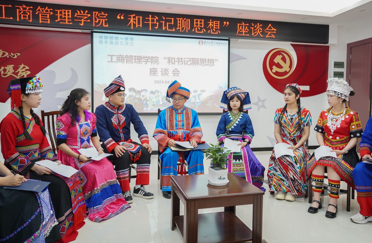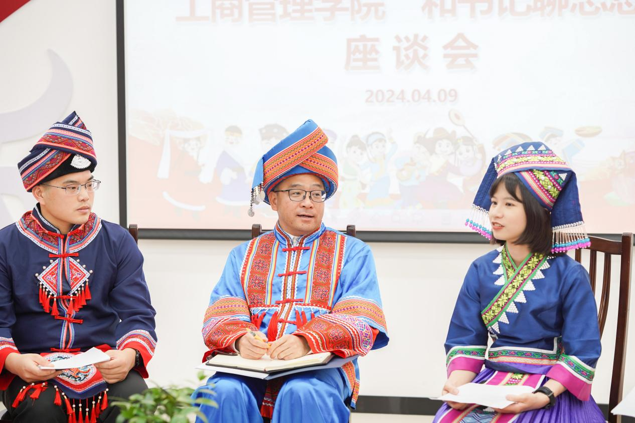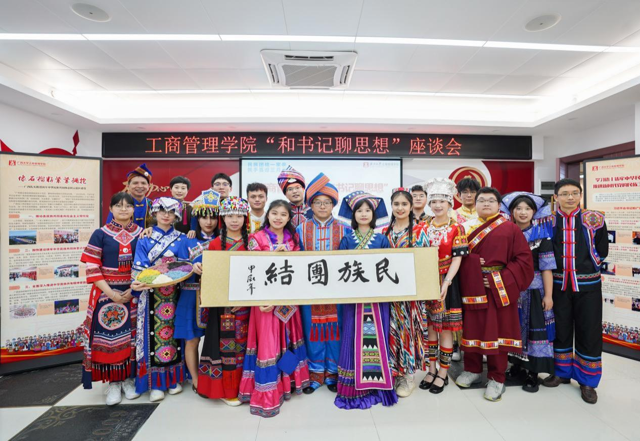 罗诚书记认真倾听学生代表们的分享,他指出,恰逢全区上下喜迎广西传统节日“三月三”,师生们身着各民族节日盛装共聚一堂,可谓是恰逢其时,不仅展示了本民族的精气神,也在交流中深刻感受到了少数民族文化的丰富多样性与独特性。他强调,学院一直高度重视并关心关注各民族学生的成长发展,教育引导各民族学生交流交往和交融,铸牢中华民族共同体意识,增强民族自豪感和归属感,希望同学们一要坚决贯彻党的民族政策,坚定对伟大祖国、中华民族、中华文化、中国共产党、中国特色社会主义的高度认同,做民族团结的拥护者;二要讲好中华民族故事,大力宣介中华民族共同体意识,做民族政策的传播者;三要自觉主动承担起铸牢中华民族共同体意识的时代重任,做铸牢中华民族共同体意识的建设者;四要胸怀天下,做构建人类命运共同体的积极实践者和推动者。