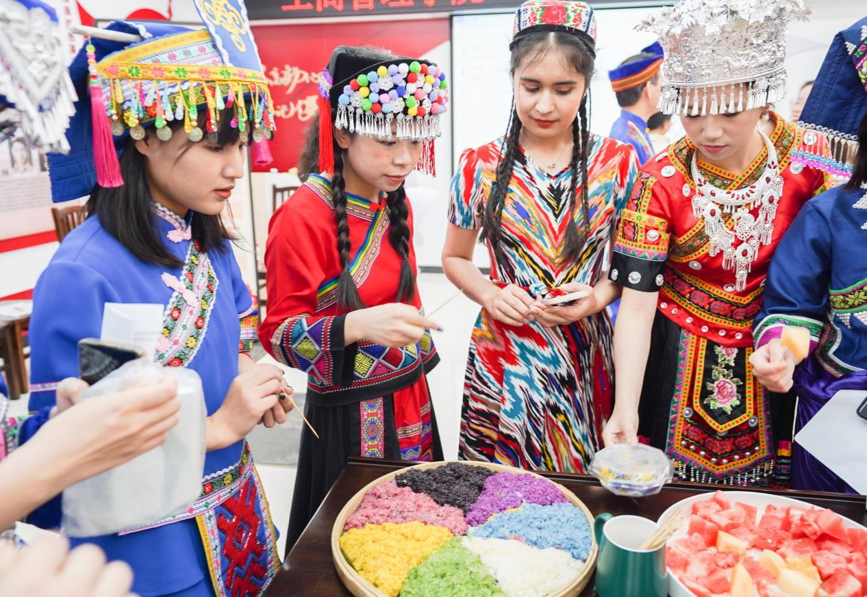 在交流过程中,同学们还表演了才艺,品尝了广西“三月三”传统美食糯米饭,现场其乐融融,气氛热烈。近2个小时的自由畅聊,传递出师生们民族大团结一家亲的良好氛围。同学们纷纷表示,要做民族团结的传播者和践行者,与各民族同学共同学习、共同进步,为铸牢中华民族共同体意识,弘扬和传承少数民族优秀传统文化贡献力量。