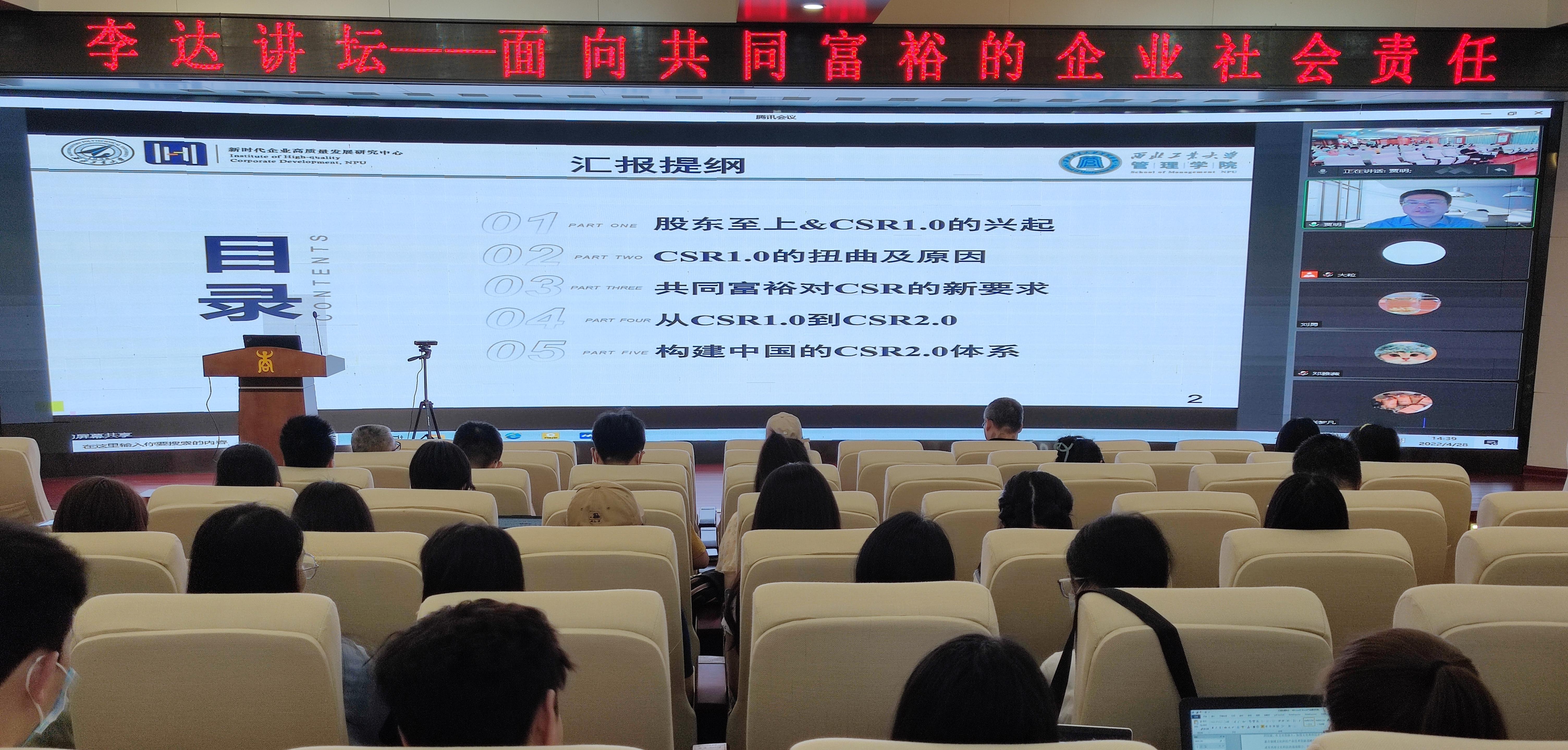 2022年4月28日下午,西北工业大学管理学院贾明教授应邀做客万象城官网第99期“李达讲坛”,带来题为“面向共同富裕的企业社会责任”的学术研究分享。讲坛在线上和线下同时进行,约120名师生参加。本次讲坛由万象城官网院长朱帮助教授主持。