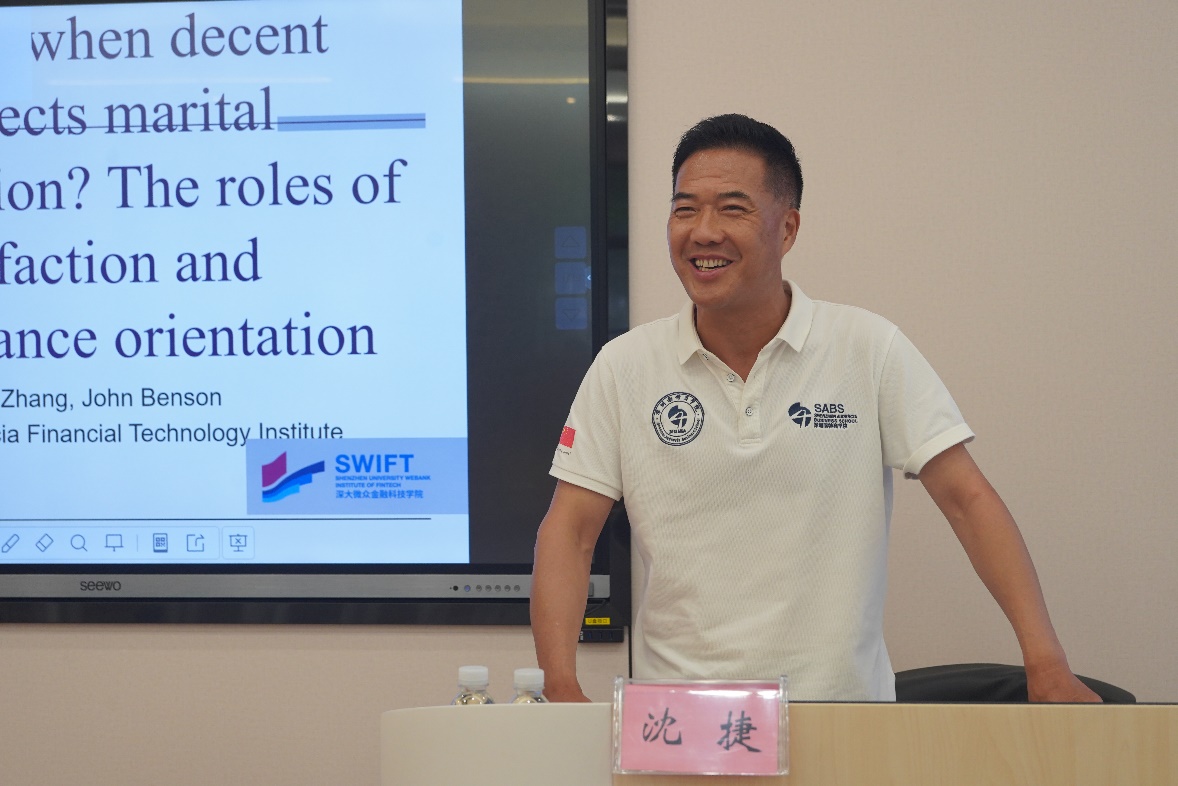 5月29日,深圳大学特聘教授、博士生导师沈捷教授受邀在学院122报告厅,以“How and when decent work affects marital satisfaction? The roles of job satisfaction and performance orientation”和“Theory applications in management research”为题为万象城官网师生作学术报告。学院副院长刘民坤教授主持讲座,相关研究方向的教师和研究生参加学习交流。